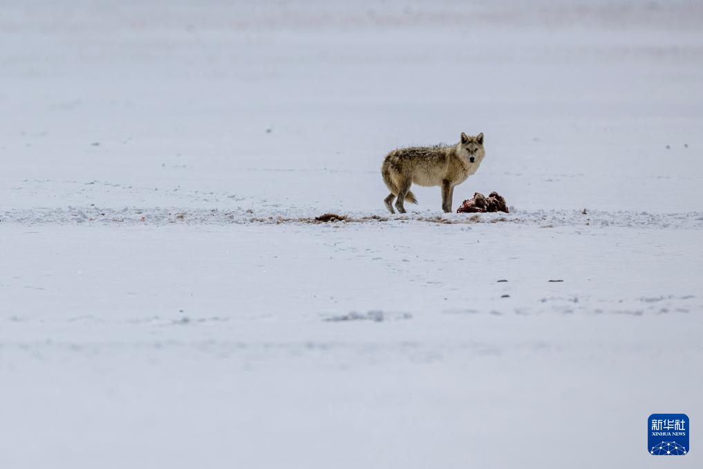 在西藏那曲市尼玛县境内的羌塘国家级自然保护区核心区,一只狼在进食(5月9日摄)。