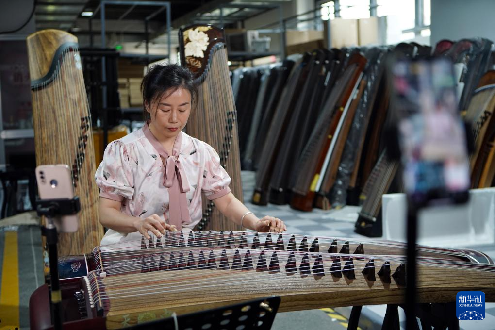 5月13日,兰考天中乐器有限公司的工作人员通过网络直播带货的方式销售古筝。
