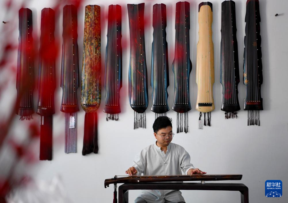 5月13日,河南省兰考县堌阳镇的斫琴师徐冰在家中弹奏古琴。