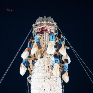 5月16日,在香港长洲岛,嘉宾为“抢包山”比赛鸣锣开赛。