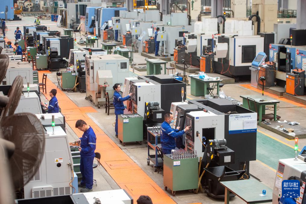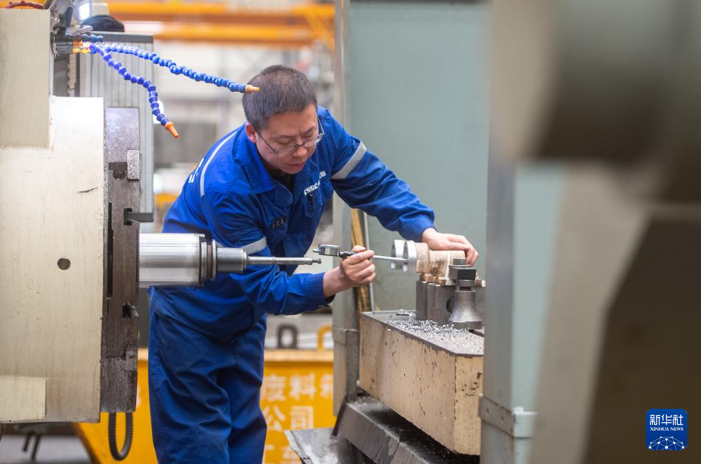 5月16日,在湖北省武汉市武昌造船生产车间,工作人员在测量工件的加工精度。