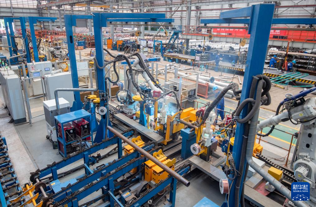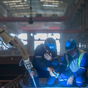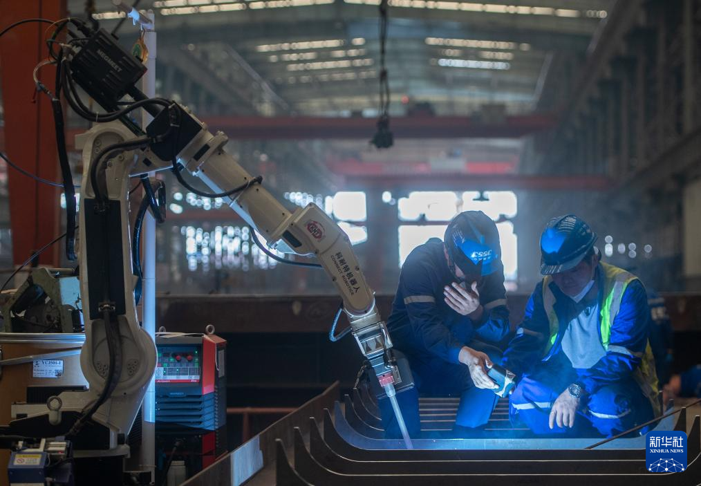 5月16日,在湖北省武汉市武昌造船生产车间,工作人员在查看焊接机器人焊接的焊缝成型。