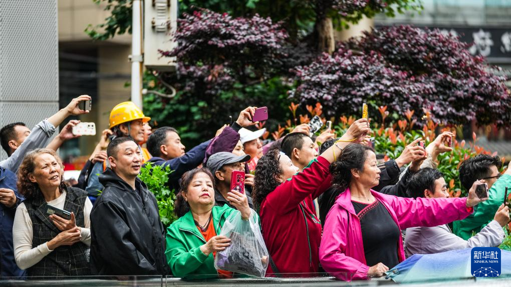 5月18日,市民在贵阳市云岩区中华北路旁观看巡游表演。