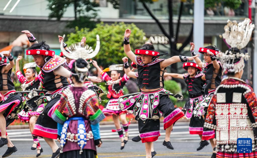 5月18日,黔东南方阵的表演队伍在进行巡游。