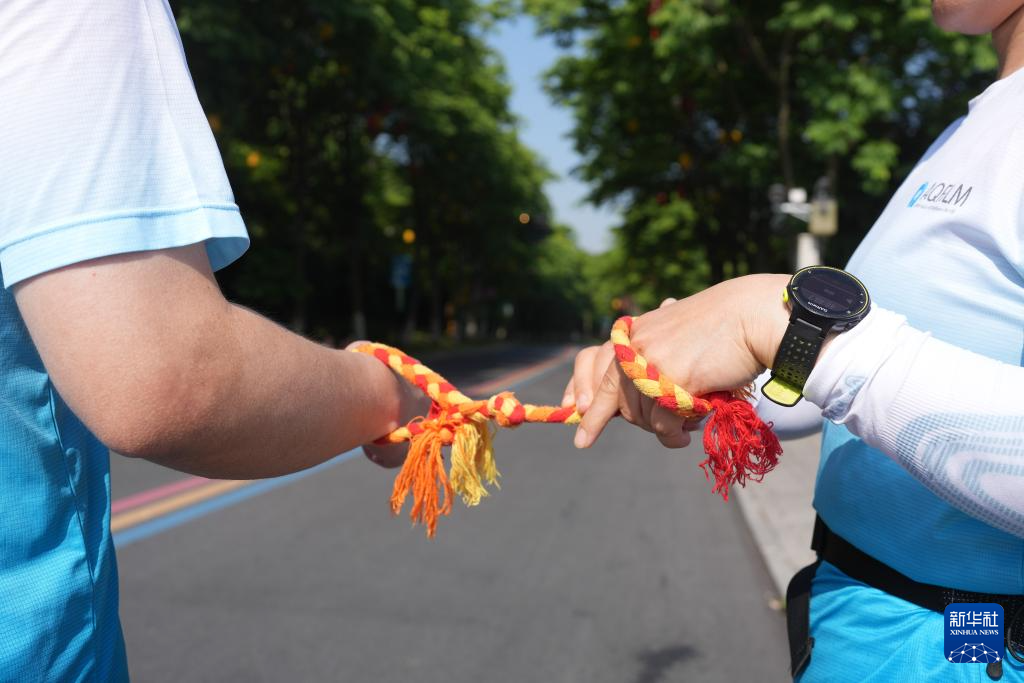 5月18日,一名助跑员用“彩虹绳”将自己和视障人士牵起来。