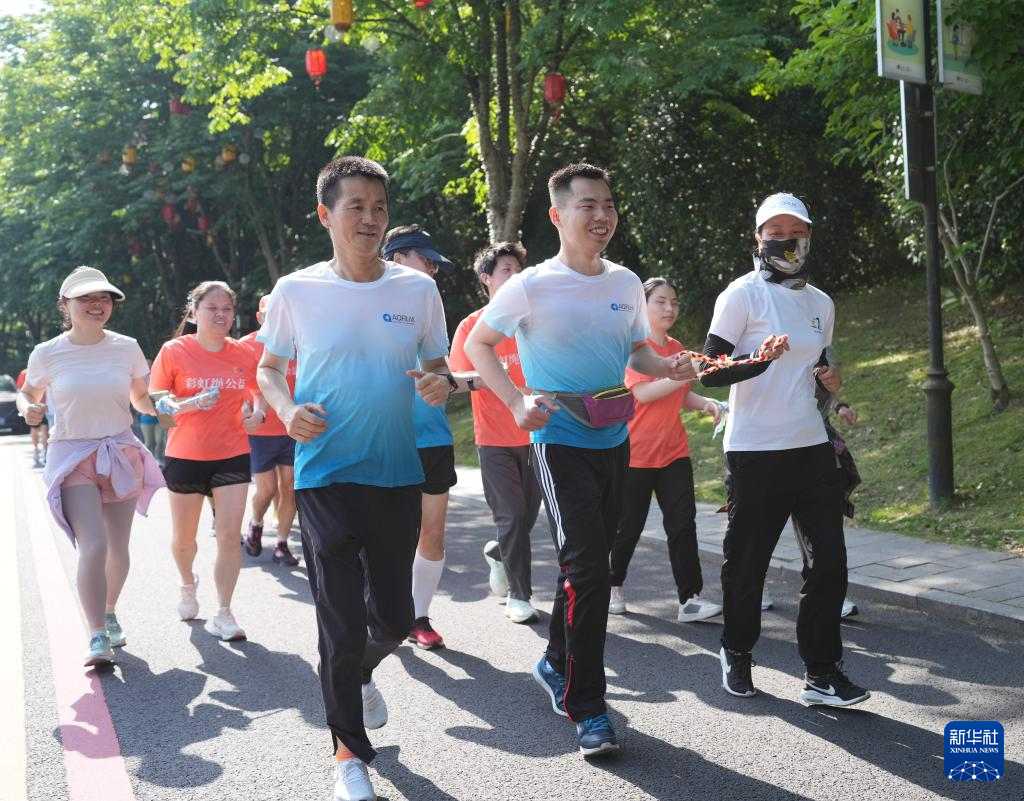 5月18日,参加“彩虹绳”例跑的人们在湖州市中心一个公园跑步。