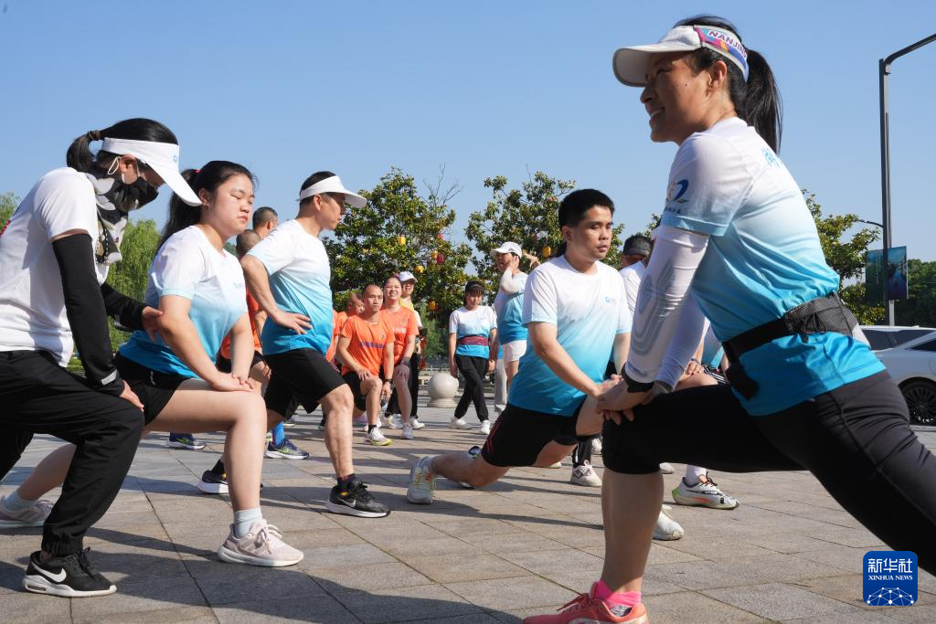 5月18日,志愿者带着视障人士做例跑前的热身。