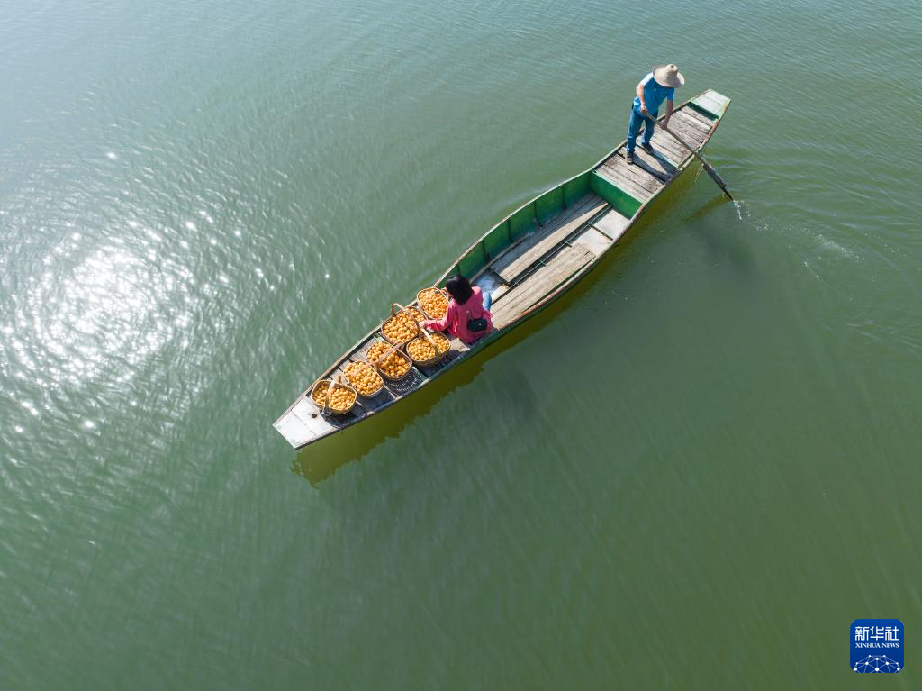5月18日,果农乘船将枇杷鲜果送往歙县漳潭村枇杷交易市场(无人机照片)。