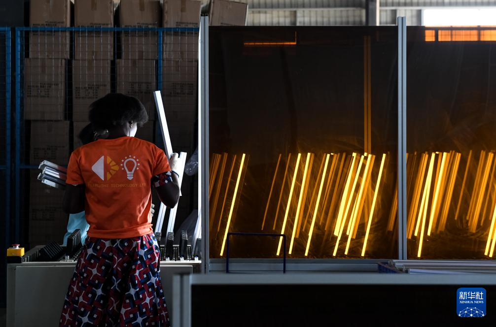 4月5日,在乌干达姆巴莱市中乌姆巴莱工业园,两名工人在明珠科技有限公司的车间进行质检。