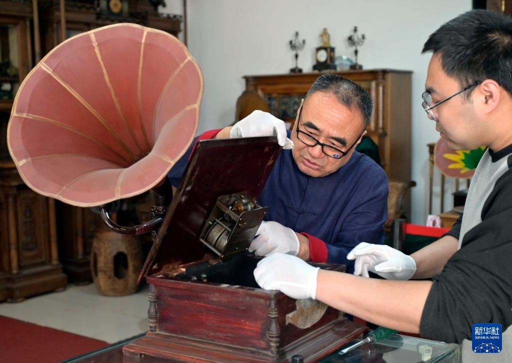5月17日,在旅顺留声机博物馆,老馆长王心伟(左)带着儿子王子鸣保养老留声机。