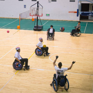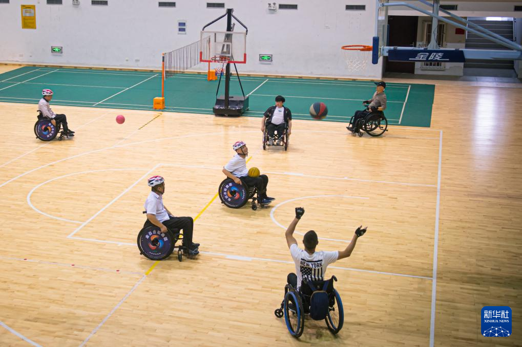 5月16日,残疾人在河庄文体中心体育馆内打篮球。