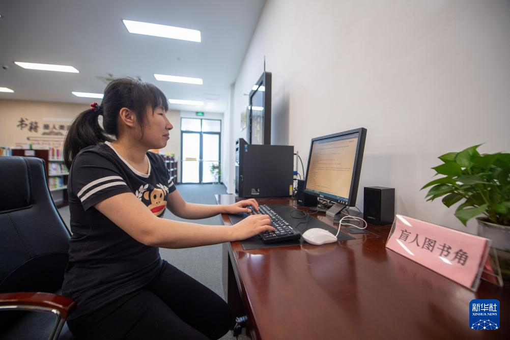 5月16日,盲人在河庄文体中心图书馆内使用安装有无障碍读屏软件的电脑上网。