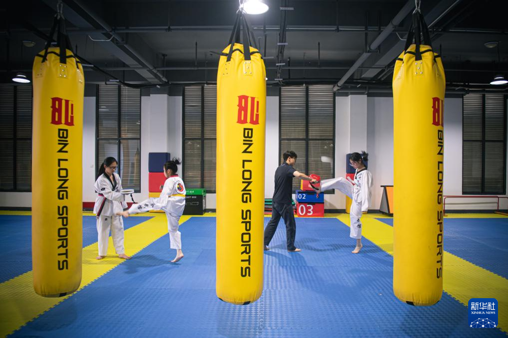 5月16日,残疾人在教练(右二)指导下在杭州市钱塘区河庄文体中心残疾人跆拳道训练基地内练习。