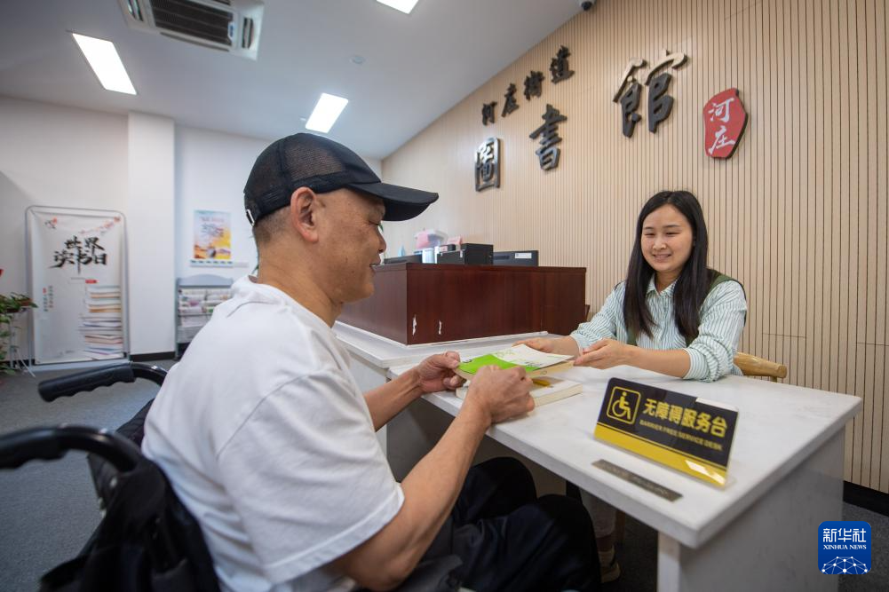 5月16日,河庄文体中心图书馆工作人员(右)在无障碍服务台为残疾人提供书籍借阅服务。