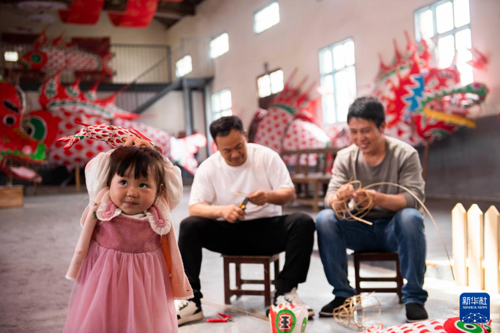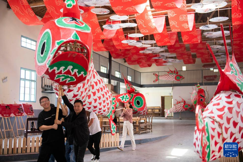 村民在溪头镇汪满田村鱼灯工坊内练习舞动长约8米的鱼灯(5月10日摄)。