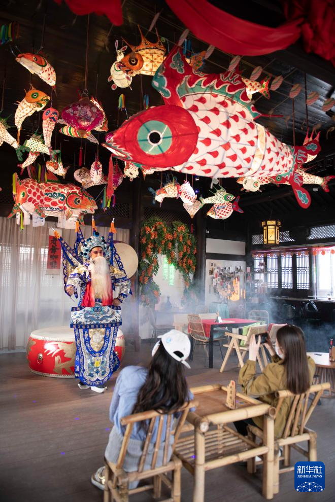 游客在歙县徽州古城一家鱼灯主题咖啡馆内欣赏徽剧表演(5月9日 摄)。