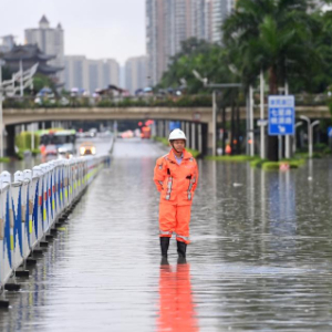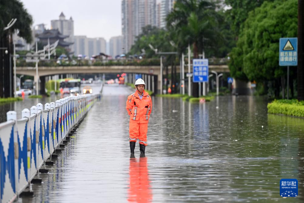 5月19日,工作人员守在南宁民族大道的积水处劝阻行人车辆不要通过。