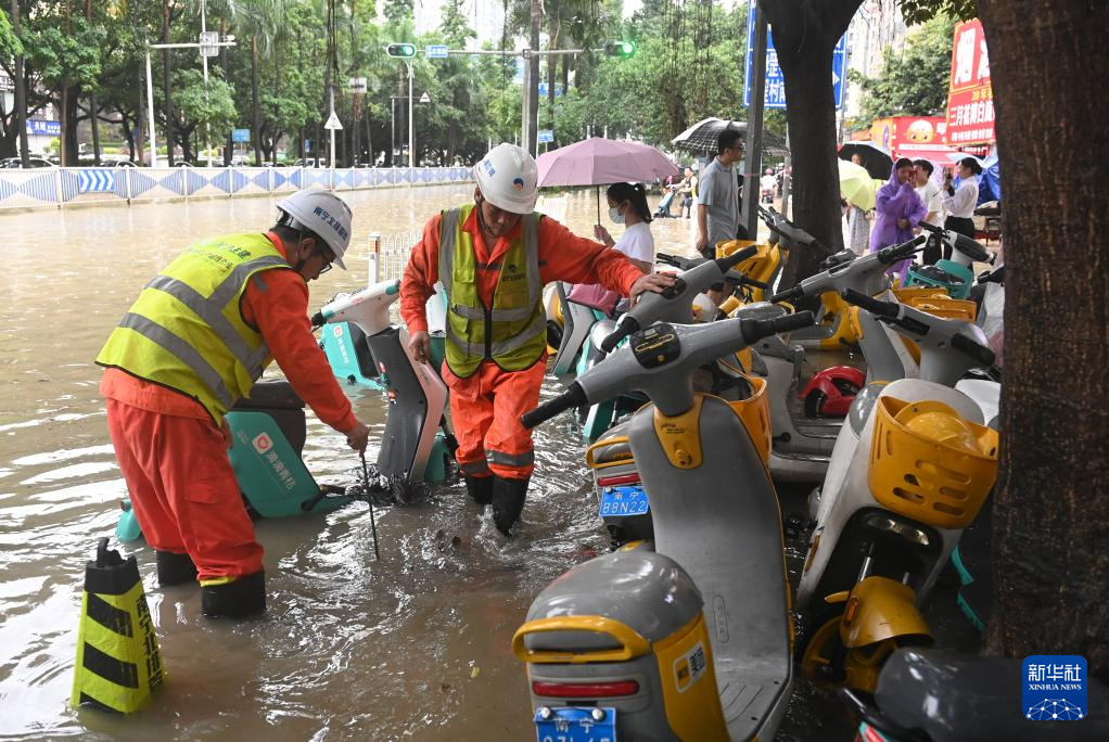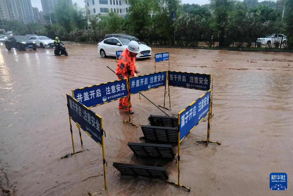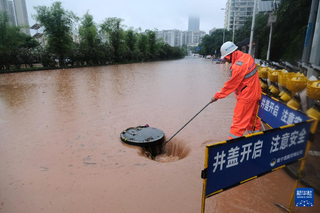 5月19日,在南宁青环路上,工作人员将下水道篦子打开加快积水下泄速度。