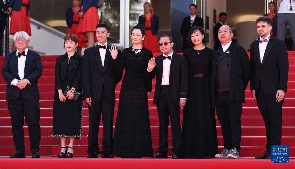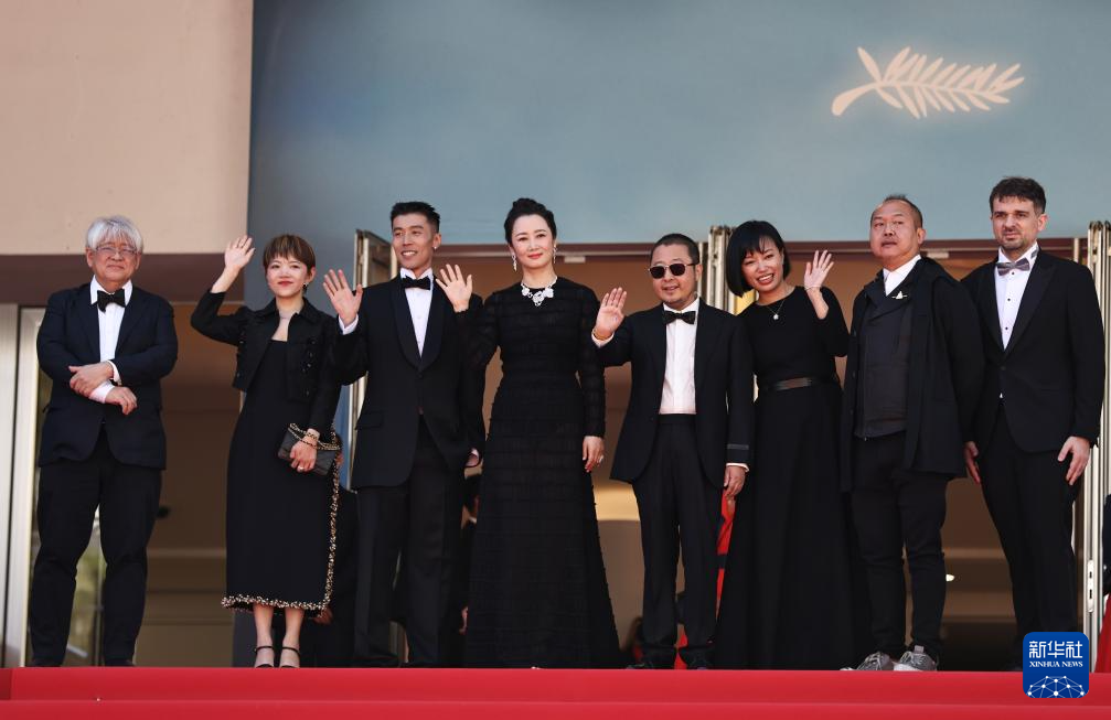 5月18日,在法国南部小城戛纳举行的第77届戛纳国际电影节上,影片《风流一代》导演贾樟柯(左三)携主创出席首映礼。