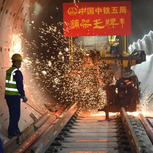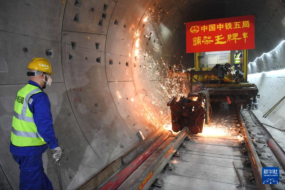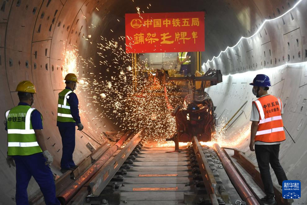 5月20日,中铁五局施工人员在合肥轨道交通8号线一期全线轨通现场作业。