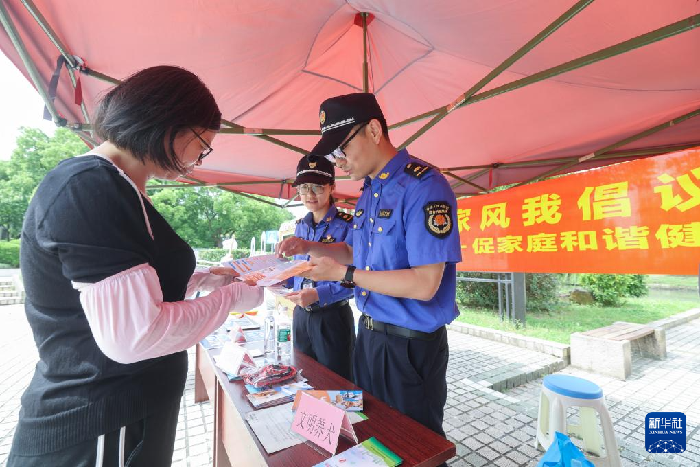 5月21日,在湖州市吴兴区龙泉街道白鱼潭社区的“有礼市集”上,综合行政执法中队的工作人员给居民普及文明养犬知识。