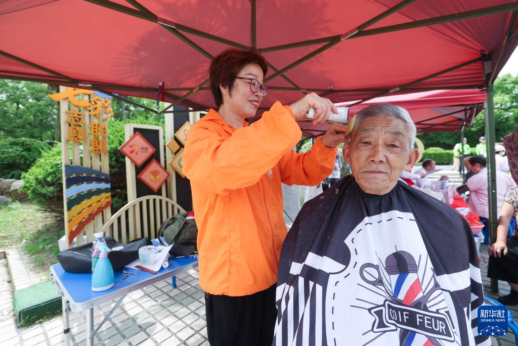 5月21日,在湖州市吴兴区龙泉街道白鱼潭社区的“有礼市集”上,党员志愿者给老人义务理发。
