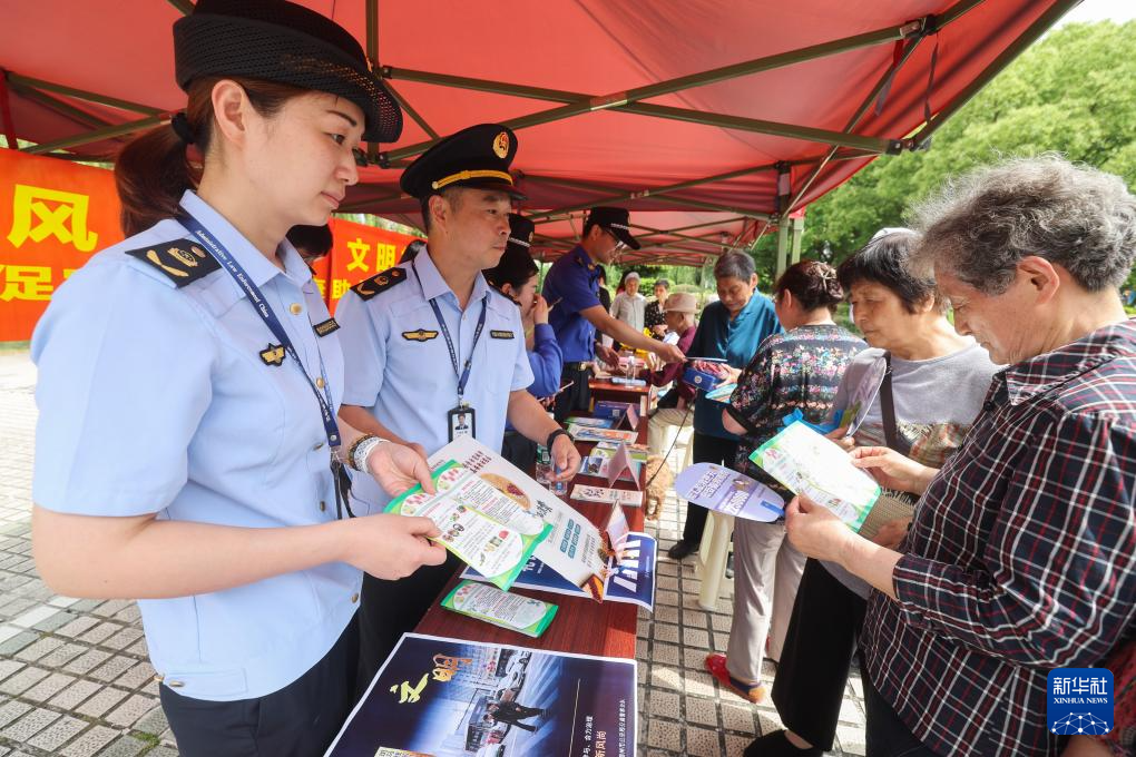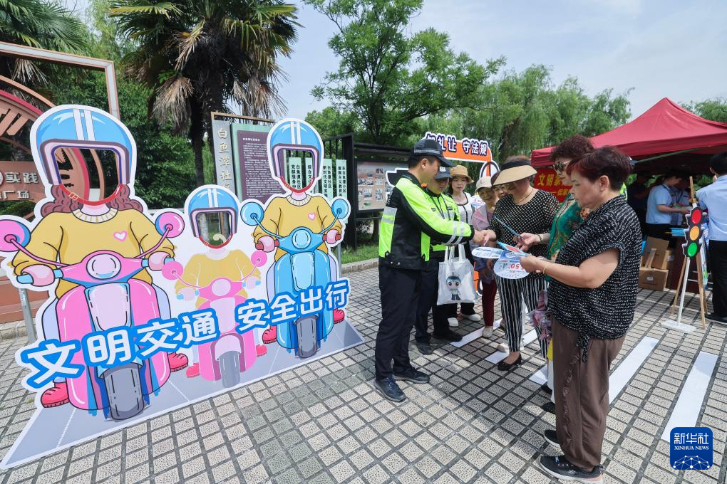 5月21日,在湖州市吴兴区龙泉街道白鱼潭社区的“有礼市集”上,交警给社区居民普及交通法规,倡导文明出行。