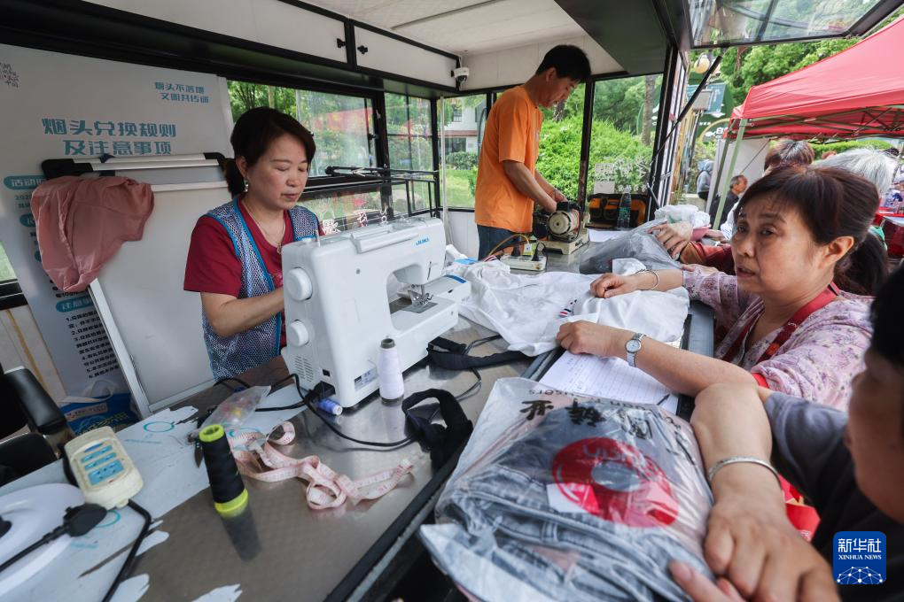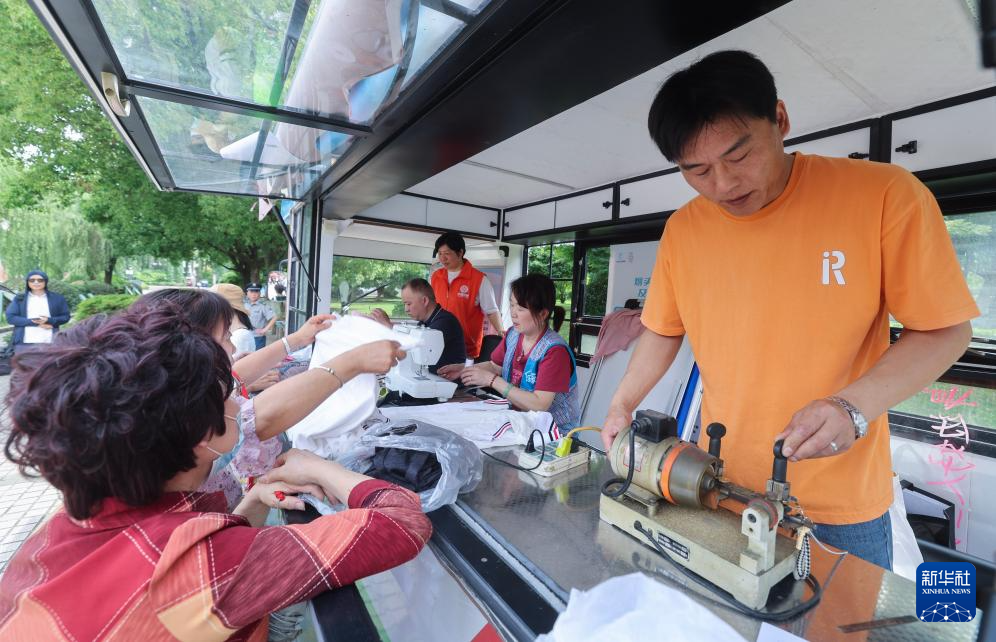 5月21日,在湖州市吴兴区龙泉街道白鱼潭社区的“有礼市集”上,志愿者给居民义务配钥匙、缝补衣物。
