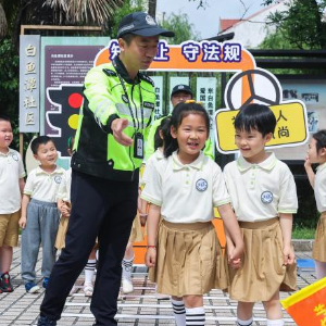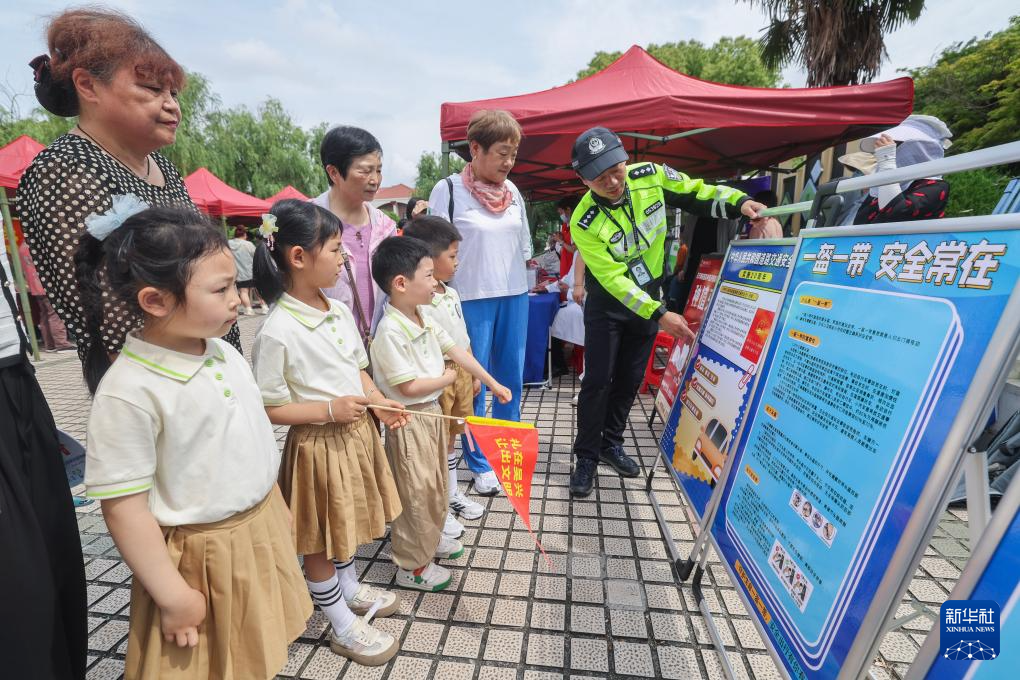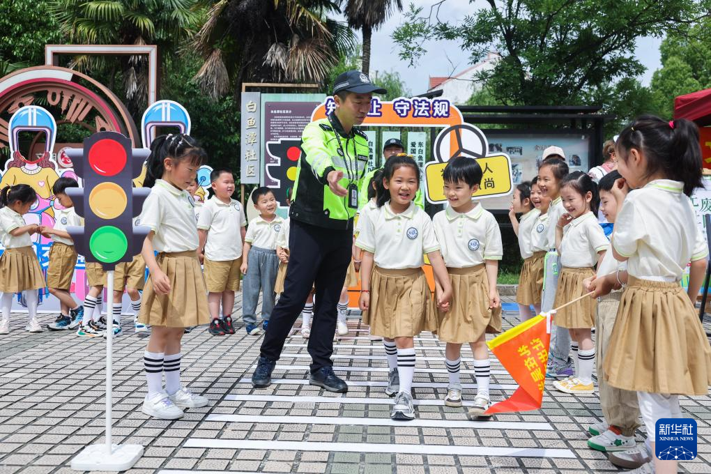 5月21日,在湖州市吴兴区龙泉街道白鱼潭社区的“有礼市集”上,交警通过场景模拟的方式为湖州市第三幼儿园的孩子们普及交通安全知识。