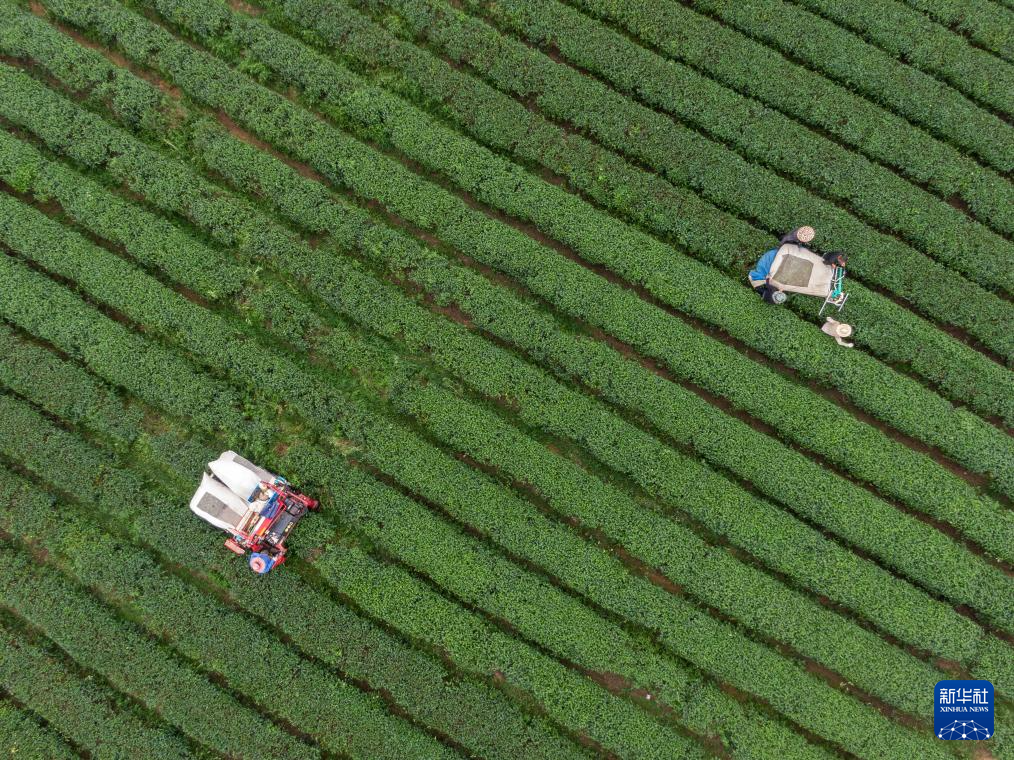 5月22日,在湖北省孝感市大悟县金墩村湖北半兵卫茶业有限公司茶园,村民在采茶(无人机照片)。