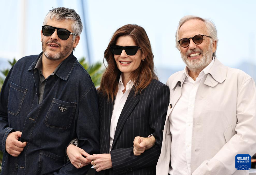 5月22日,在法国南部小城戛纳举行的第77届戛纳国际电影节上,法国导演克里斯托夫·奥诺雷(左)与法国演员齐雅拉·马斯楚安尼(中)、法布里斯·卢基尼亮相影片《我的马赛洛》的拍照式。