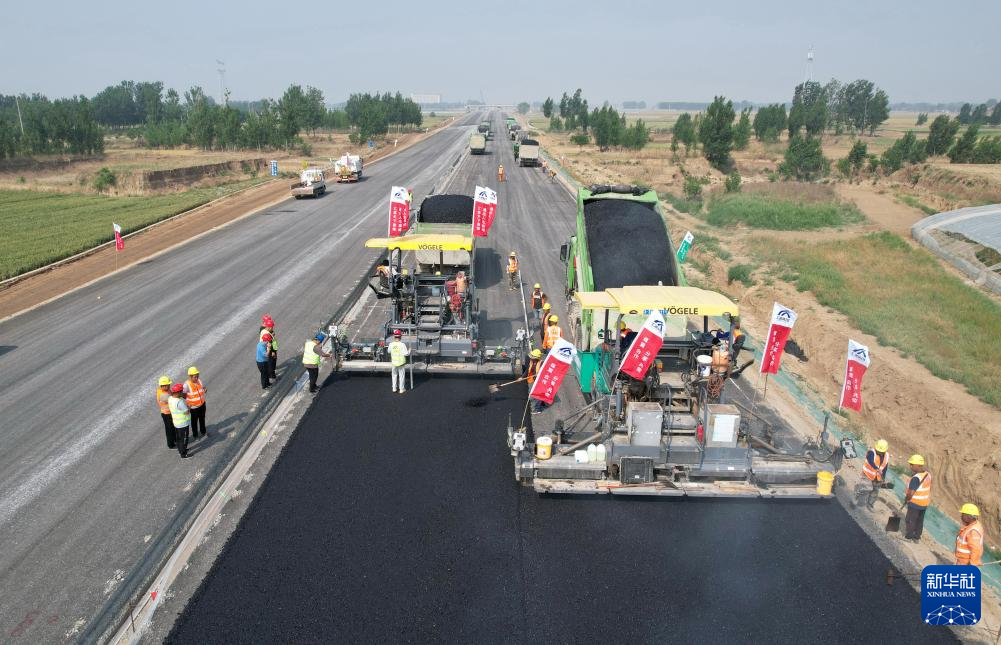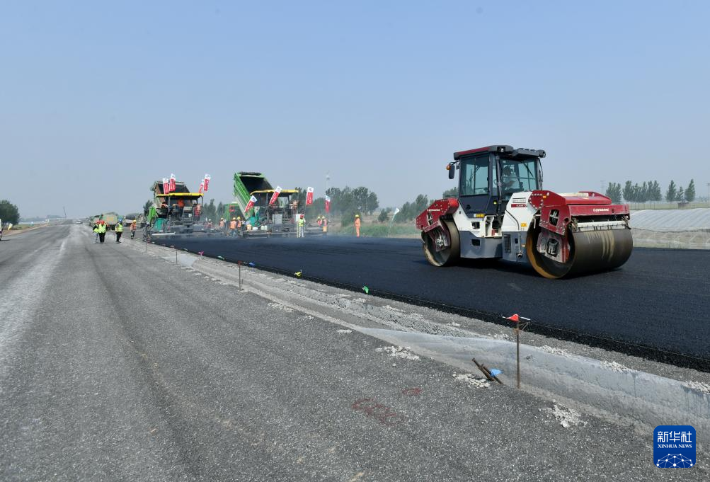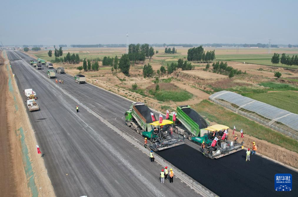 5月22日,工人在河北省肃宁县境内的曲港高速沧州段建设工地施工(无人机照片)。