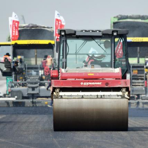 5月22日,工人在河北省肃宁县境内的曲港高速沧州段建设工地施工。