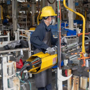 5月23日,在日照市五莲县五征集团焊装车间,工人为汽车车身上机器人焊接不到的位置进行人工加焊。