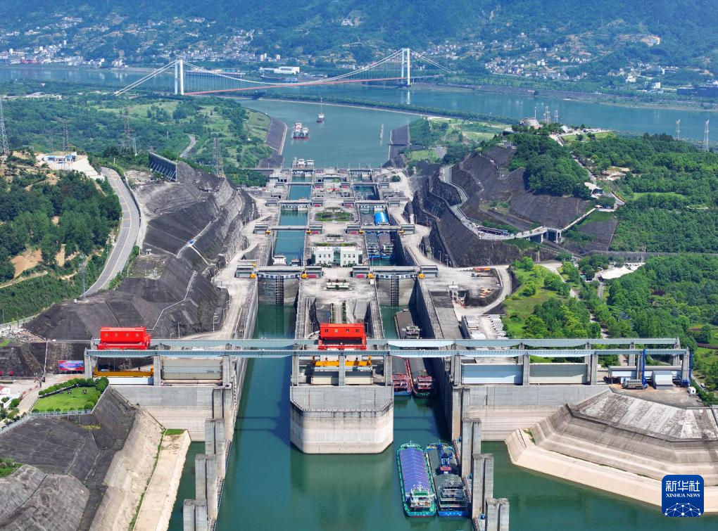 5月23日,在湖北省宜昌市,船舶有序通过三峡双线五级船闸(无人机照片)。