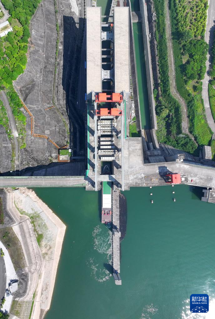 5月23日,在湖北省宜昌市,船舶有序通过三峡水利枢纽工程升船机(无人机照片)。