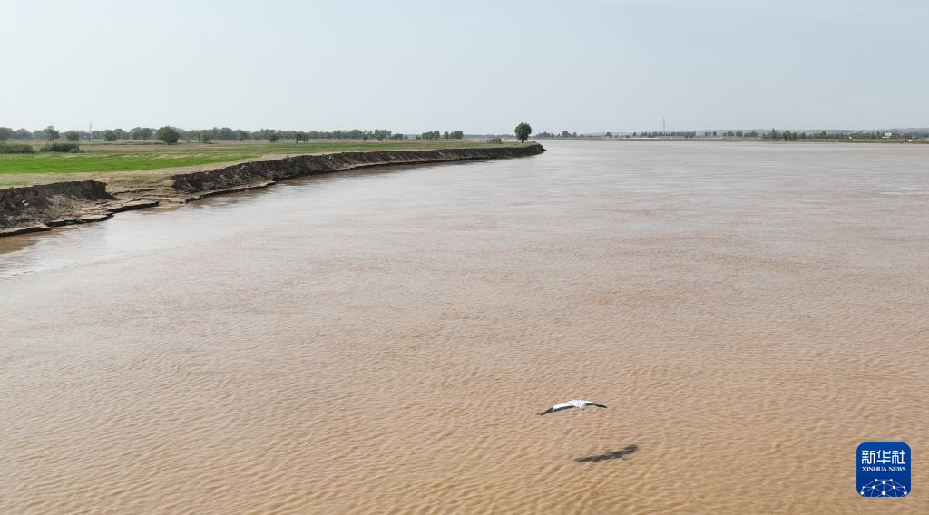 5月22日,水鸟在流经内蒙古呼和浩特市托克托县的黄河上飞翔(无人机照片)。