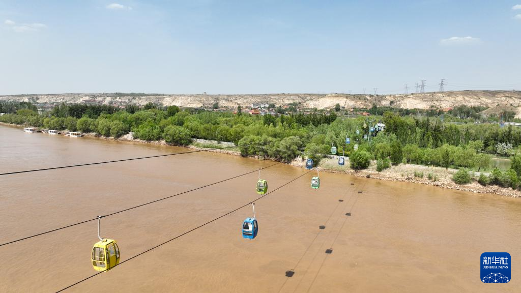 这是5月22日在内蒙古呼和浩特市托克托县神泉生态旅游风景区拍摄的黄河缆车(无人机照片)。