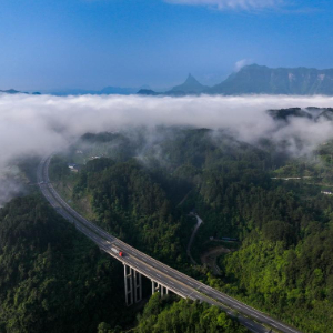 5月23日,重庆市南川区金佛山东麓云海景观和山间高速公路交织(无人机照片)。