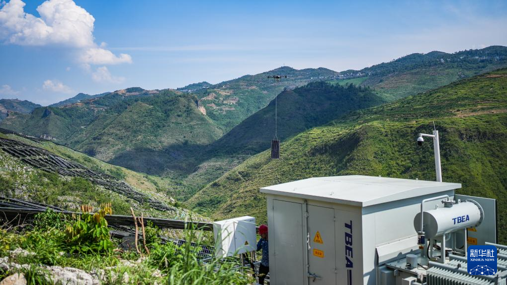 在盘江百万千瓦级光伏基地,无人机在调运光伏板(5月23日摄)。