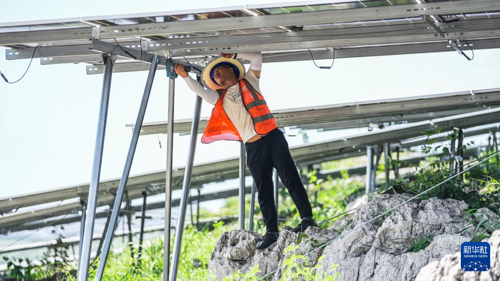 在盘江百万千瓦级光伏基地,贵州能源集团的工人在维修并安装光伏板(5月23日摄)。