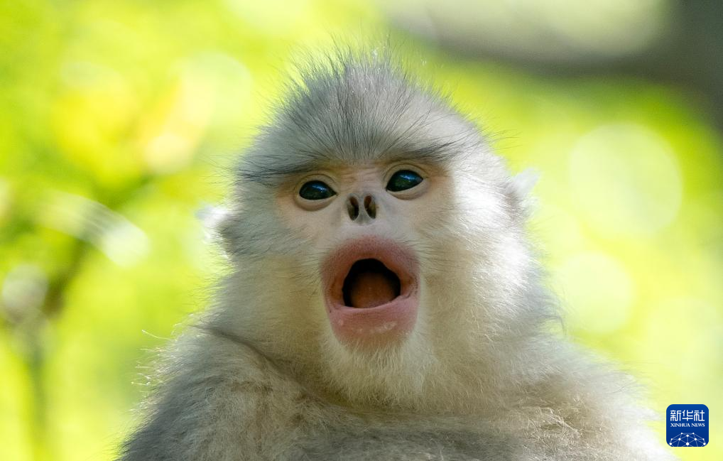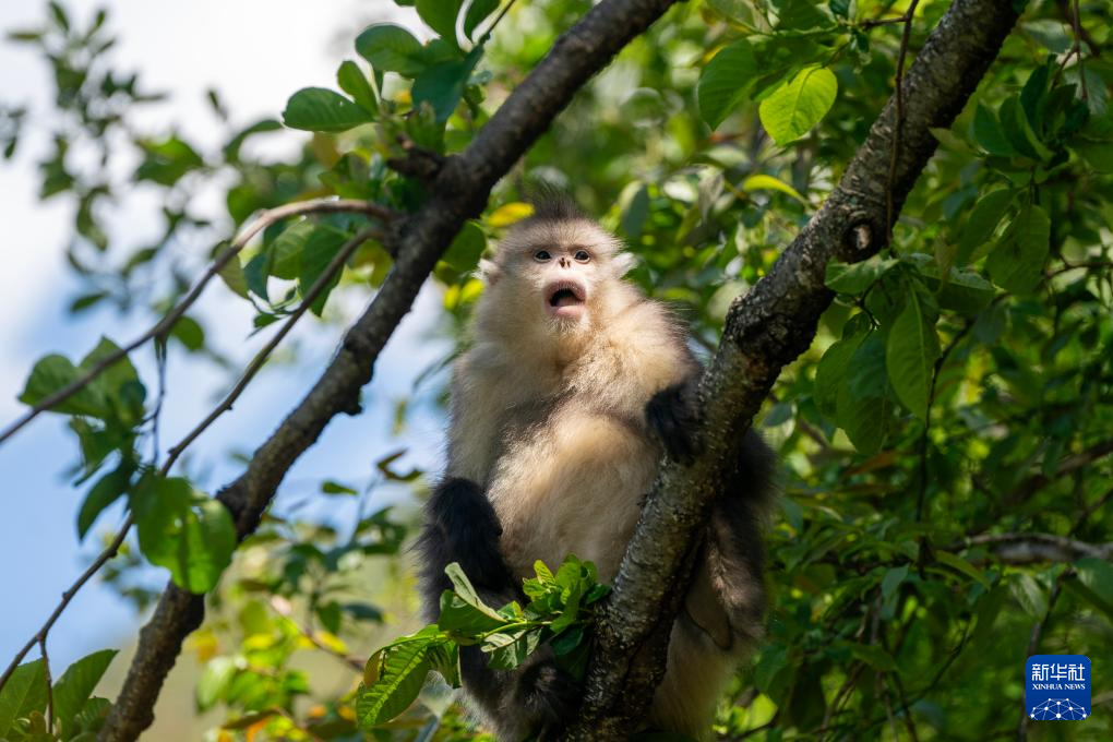 5月23日,在白马雪山国家级自然保护区响古箐片区内,一只滇金丝猴在枝头发出叫声。