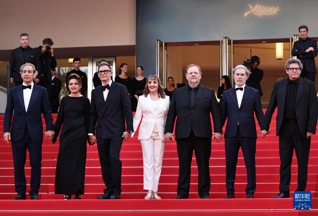 5月24日,在法国南部小城戛纳举行的第77届戛纳国际电影节上,主竞赛单元影片《珍奇之物》导演米歇尔·阿扎纳维修斯(左三)携主创人员踏上首映式红毯。