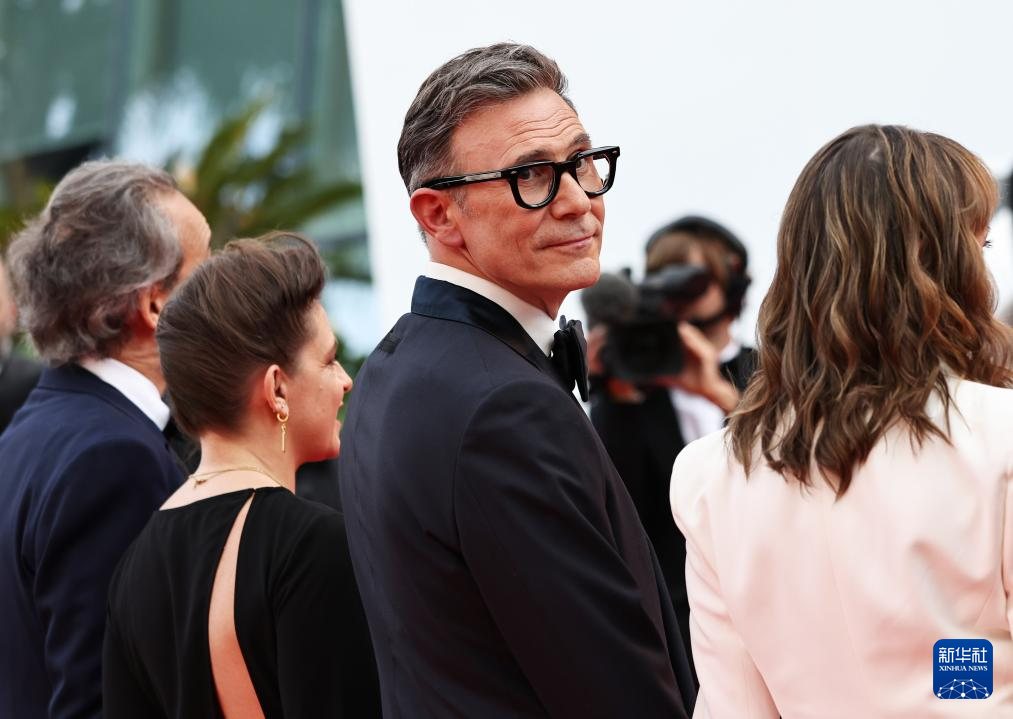 5月24日,在法国南部小城戛纳举行的第77届戛纳国际电影节上,主竞赛单元影片《珍奇之物》导演米歇尔·阿扎纳维修斯(中)携主创人员踏上首映式红毯。
