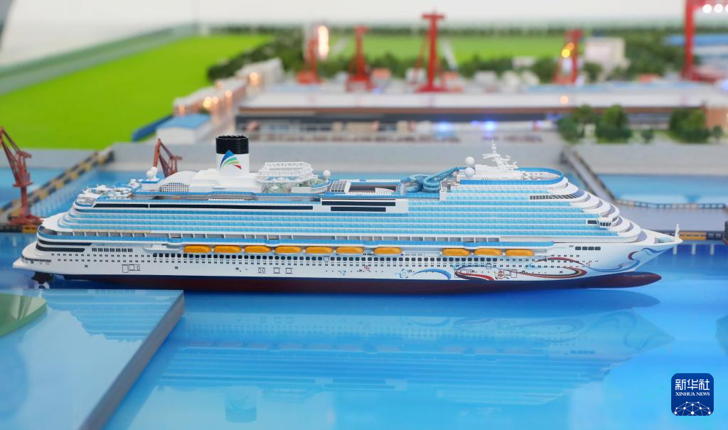这是5月26日在上海浦东新区上海外高桥造船有限公司2号船坞拍摄的首艘国产大型邮轮“爱达·魔都号”模型。