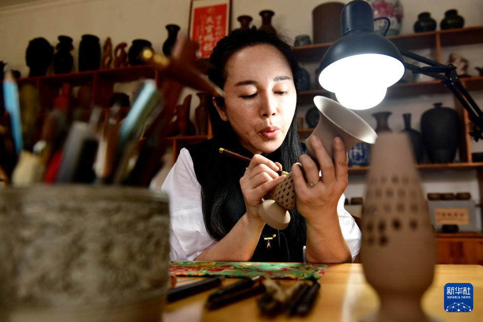 5月26日,在日照黑陶邢艺术厂,省级非遗传承人邢葆东在修复黑陶。
