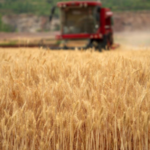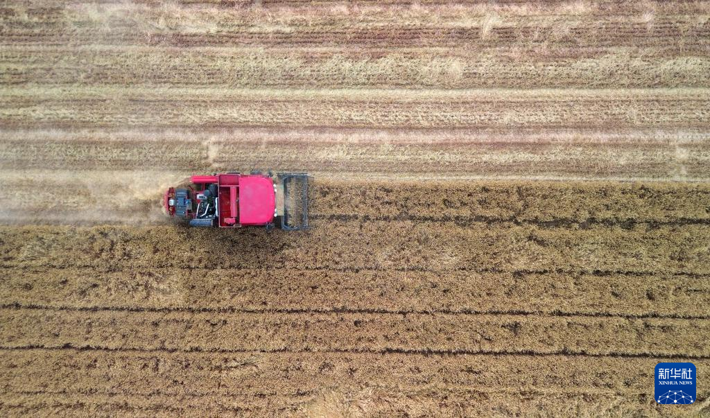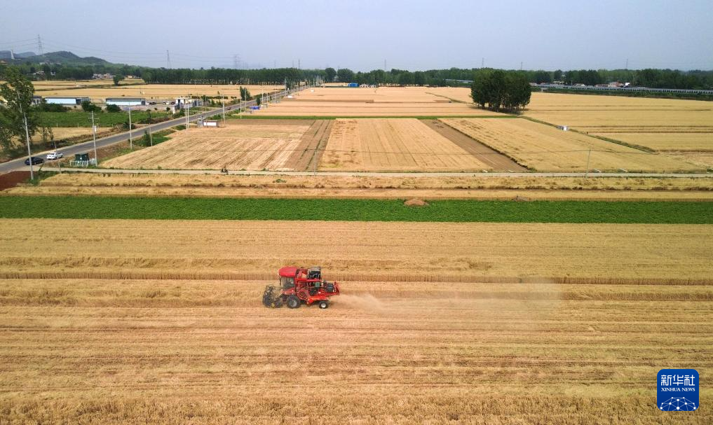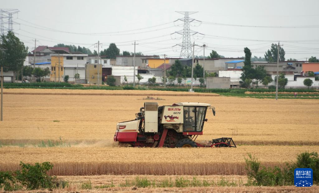 5月29日,在山东省滕州市东沙河街道,农机手驾驶收割机收割小麦。
