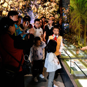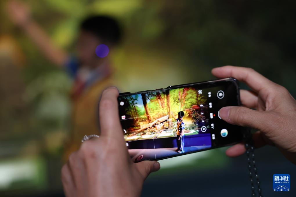 游客用手机拍摄张书铖在甘肃省博物馆古生物化石展厅的讲解过程(5月28日摄)。