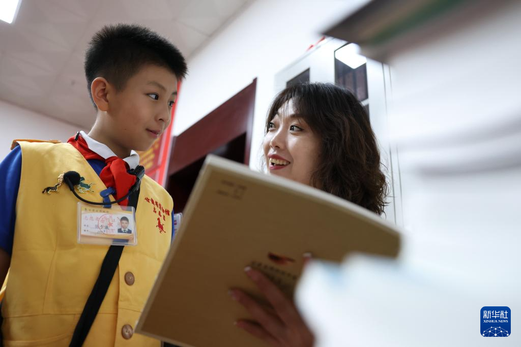 张书铖(左)在甘肃省博物馆志愿者总站和指导老师刘婷交流(5月28日摄)。
