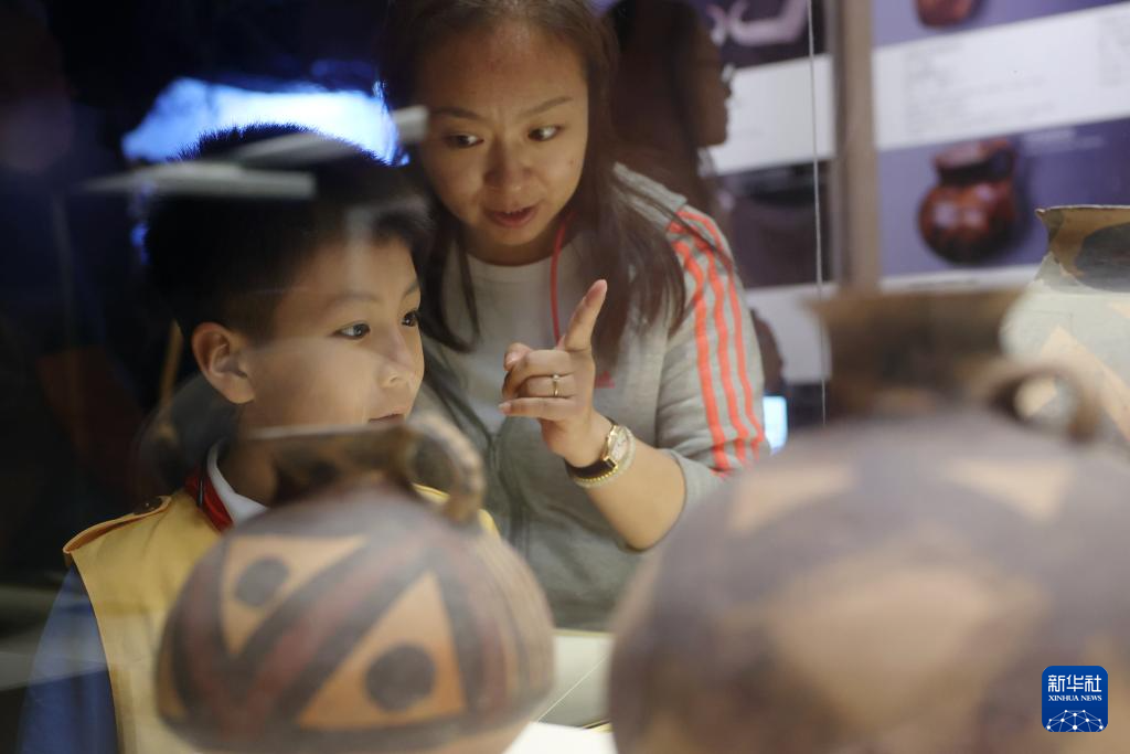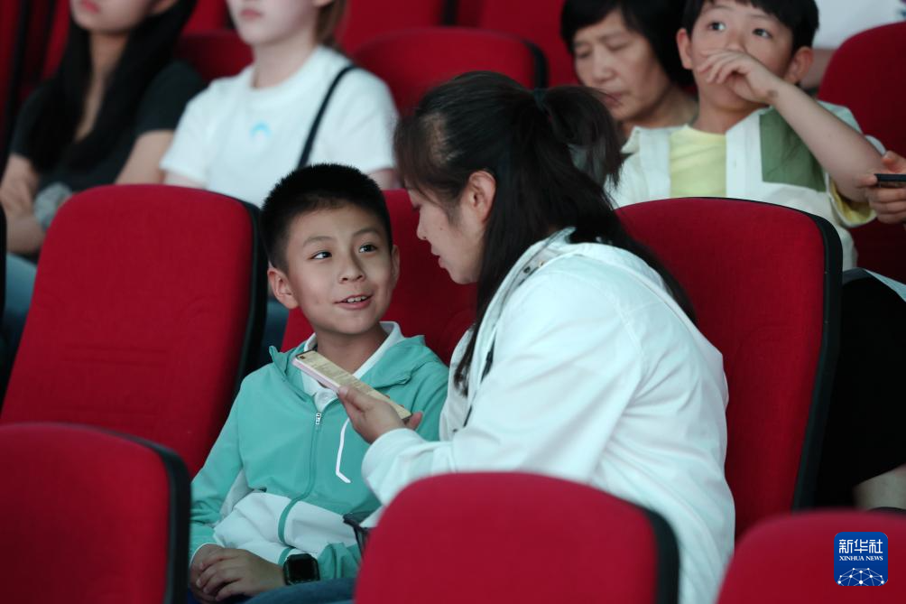 张书铖(左)和母亲姜楠在甘肃省博物馆展厅内参观学习(5月28日摄)。
